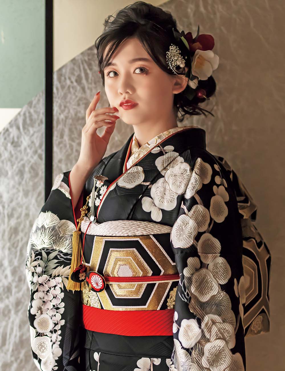 楽しげに咲く椿や梅はお祝いムードに包まれ、一度きりのアニバーサリーを慈しむようです。濃い地色に映える妖艶な色選びが心憎い振袖です。