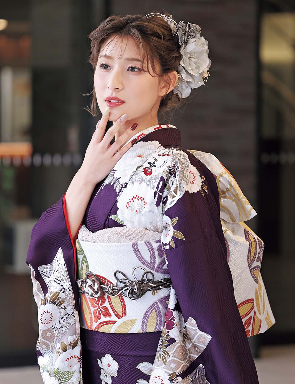 貴婦人のような紫の地に、まばゆい銀彩を惜しみなく散りばめた振袖。空へと弾む毬や貝桶に色とりどりの吉祥の花々が寄り添い、極上の風雅が生まれます。