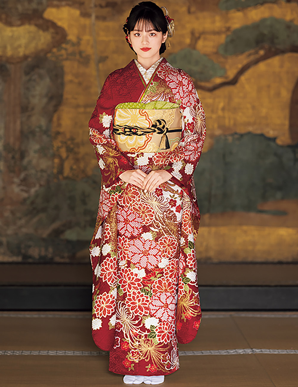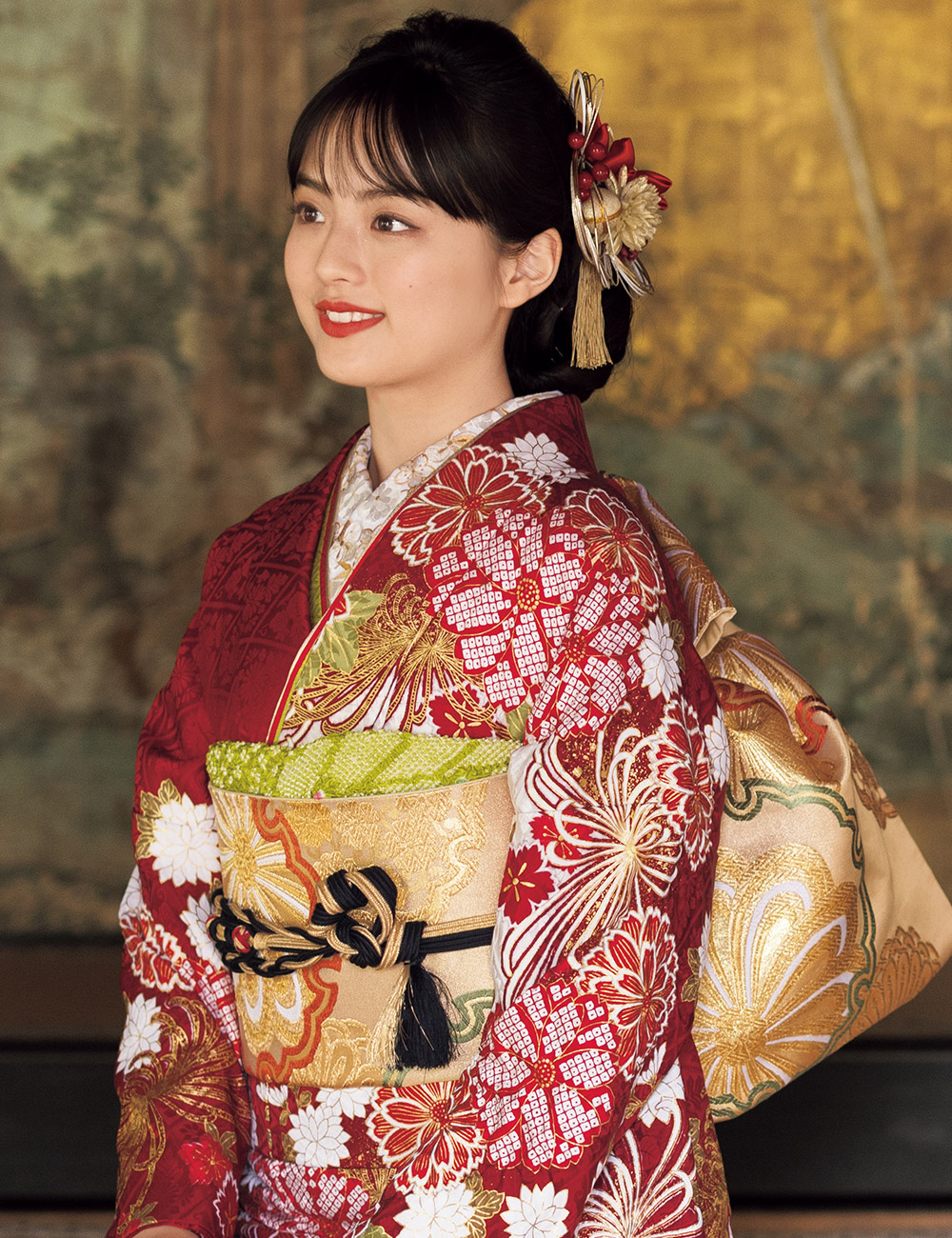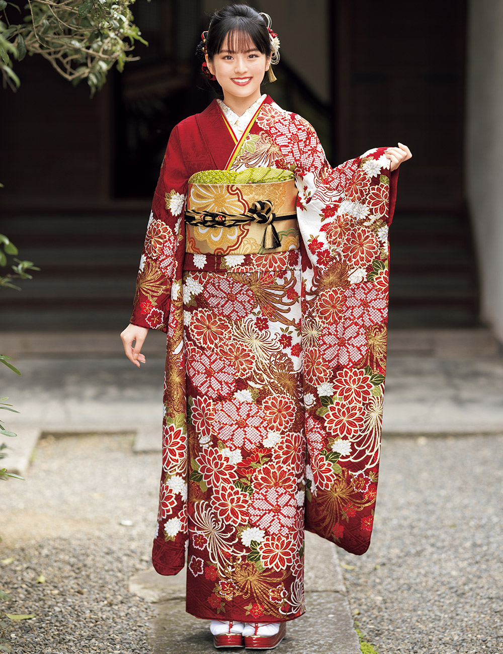 職人の熟練の技を昇華させた金彩が、特別な存在感を放つ振袖。目が覚めるような朱赤に四季の和花を携え、平安のお姫様のごとく輝いて。