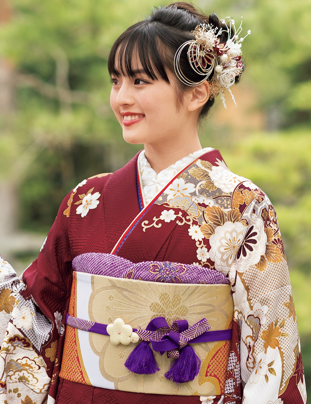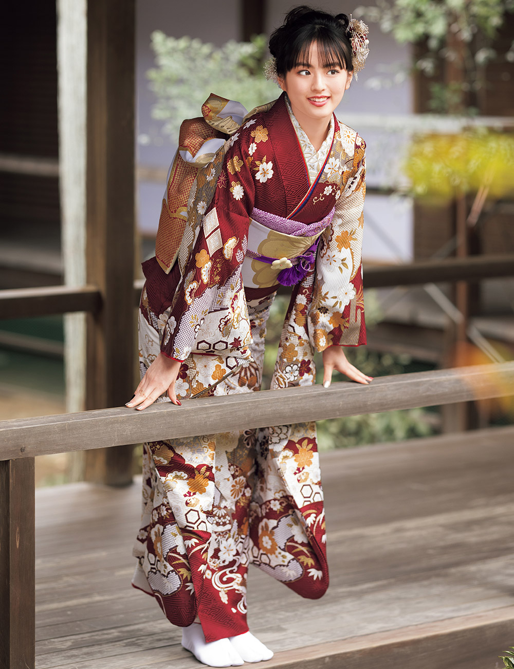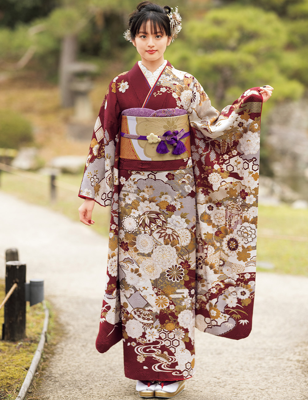 姫君に愛でられた貝桶や毬など、おめでたいモチーフが心地よい物語を紡ぐ振袖。落ち着いた赤地を彩るレトロシックな色合いが、さらに魅力を引き立てます。
