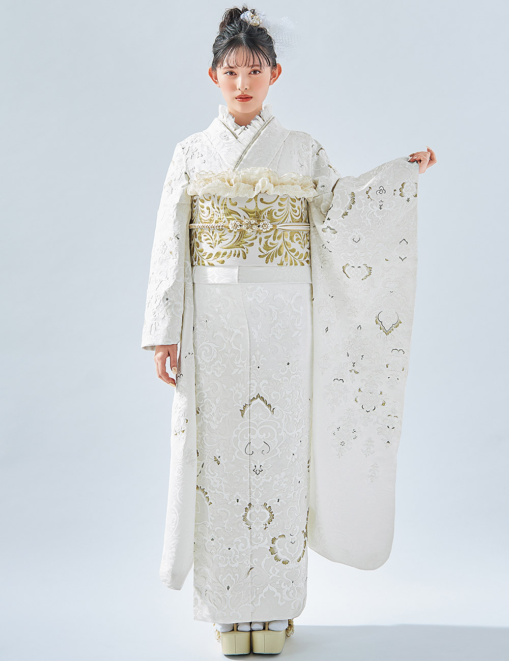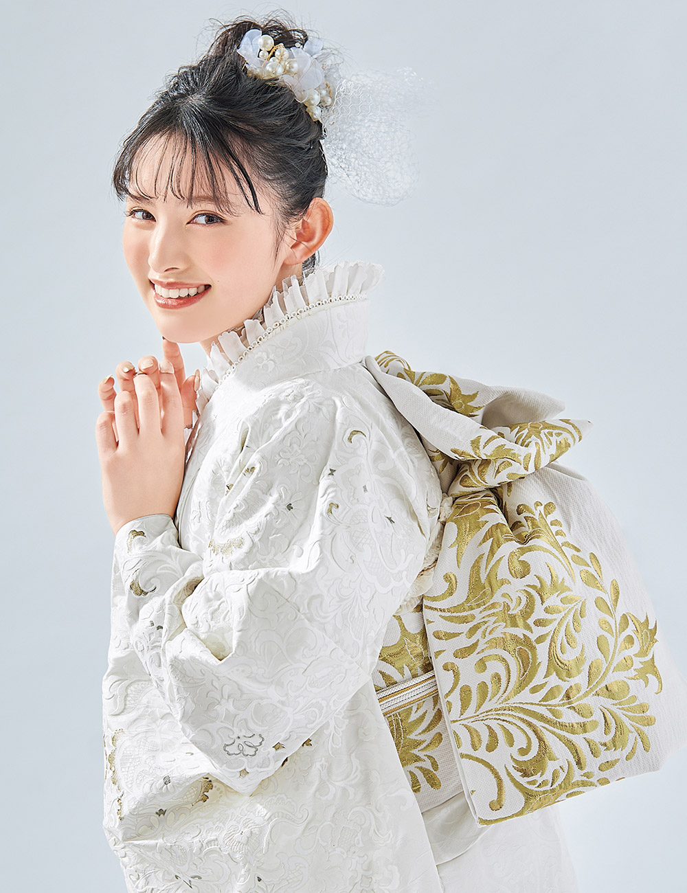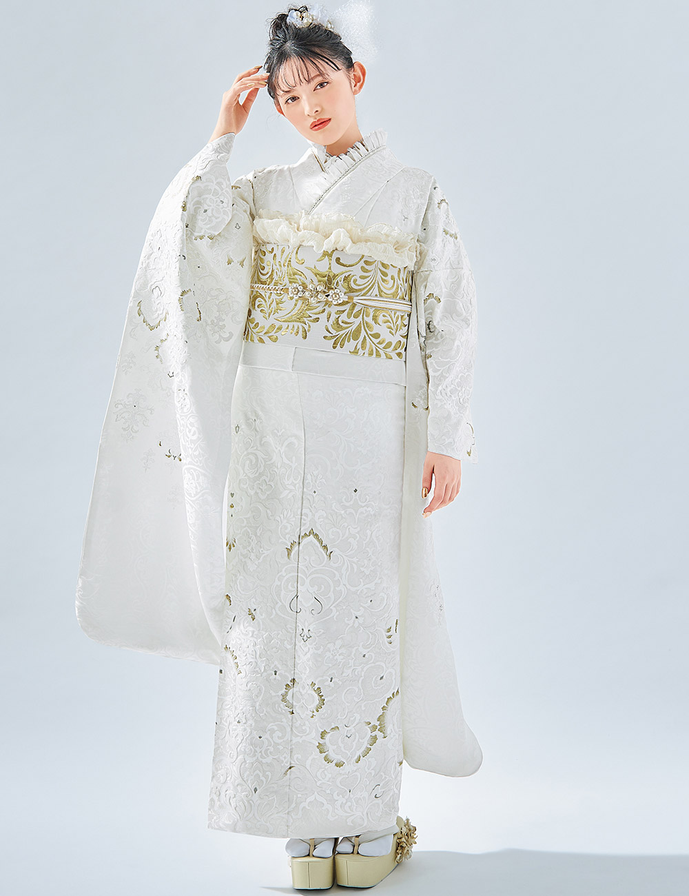 洋風エレガントな純白の振袖は、自分らしい着こなしを叶える一枚。オリエンタルな空気が漂う文様や立体感のある風合いで、幻想的な雰囲気を醸し出します。