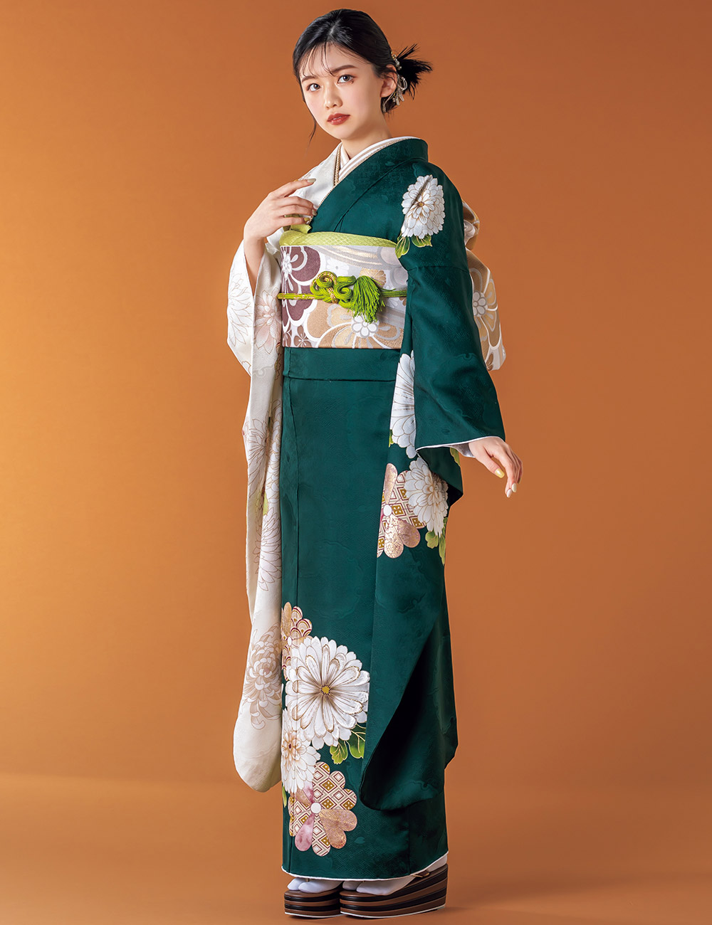 深みのあるグリーンと余白を生かしたツートーンの世界観が印象深い振袖。立体的に描かれた大輪の菊、きめ細やかな亀甲や青海波が至福の一日に華を添えます。