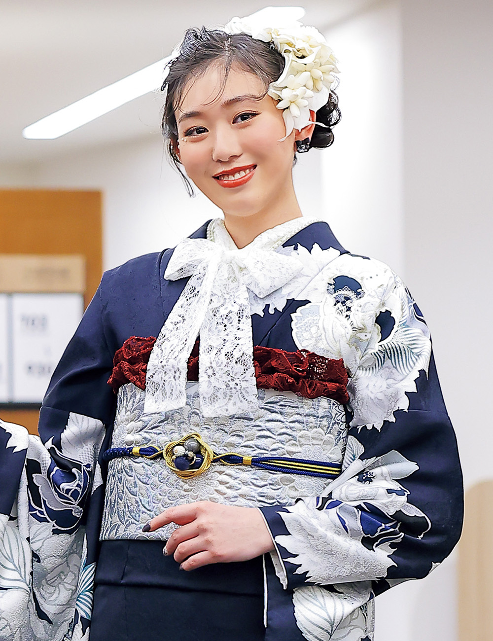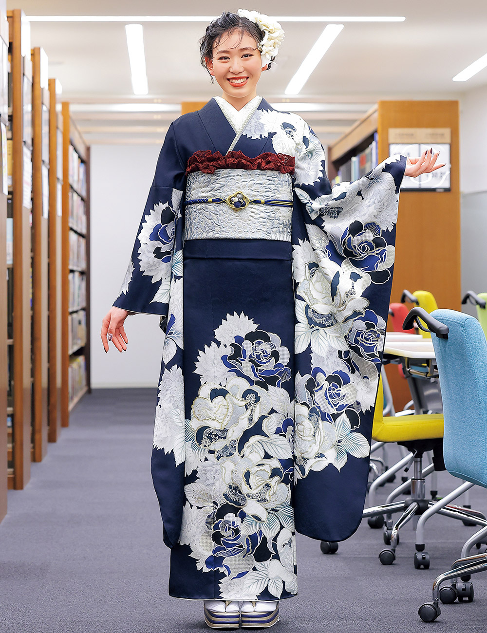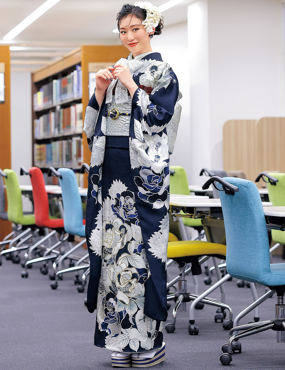しなやかに描かれた慶びの草花が、門出の時を祝すよう。肌を綺麗に見せる落ち着いた藍色の地に銀彩が冴え渡り、ドラマティックな情景が広がる振袖です。